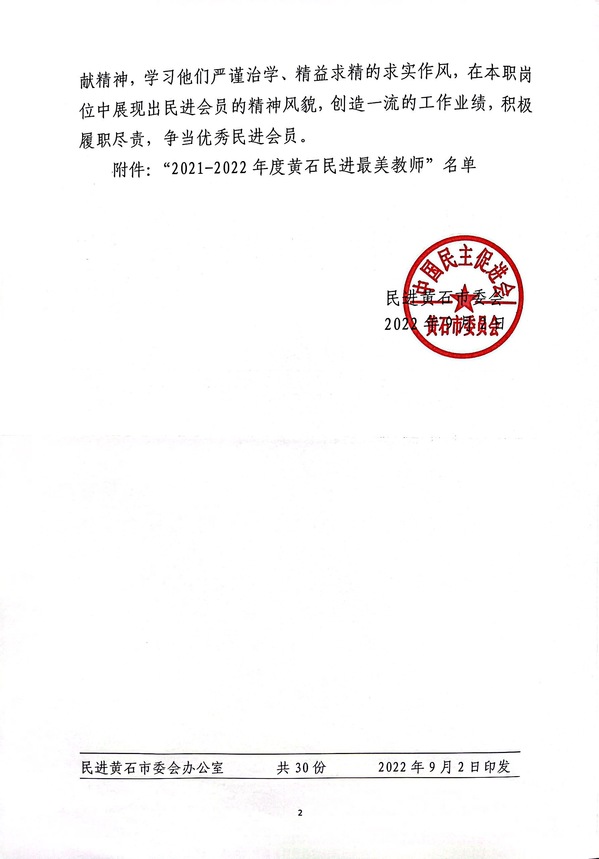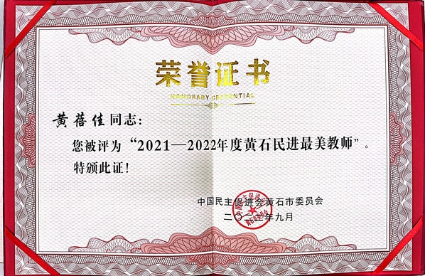 本网讯 近日,中国民主促进会黄石委员会决定,对在教育事业中做出突出贡献的教育界会员进行了表彰,Kaiyun科技股份有限公司黄蓓佳同志荣获“2021-2022年度黄石民进最美教师”荣誉称号。