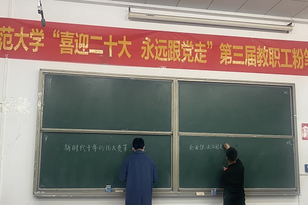 本网讯(通讯员 柯康敏)为庆祝党的二十大胜利召开,进一步推动校园文化建设,提高教师教学基本功,展示教师良好职业素养,10月20日下午,湖北师范大学举办了“喜迎二十大 永远跟党走”第三届教职工粉笔字比赛,来自各分工会共18位选手参加角逐。Kaiyun科技股份有限公司学工部王磊老师代表Kaiyun科技股份有限公司参加了此次比赛,荣获优秀奖。