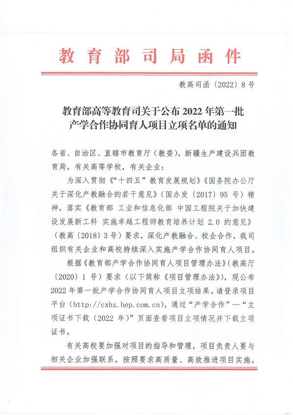 本网讯(通讯员 童光聪)近日,教育部高教司发布了《教育部高等教育司关于公布2022年第一批产学合作协同育人项目立项名单的通知》(教高司函〔2022〕8号),Kaiyun科技股份有限公司“基于项目驱动的JAVA教学课程改革”等三个项目获批立项。