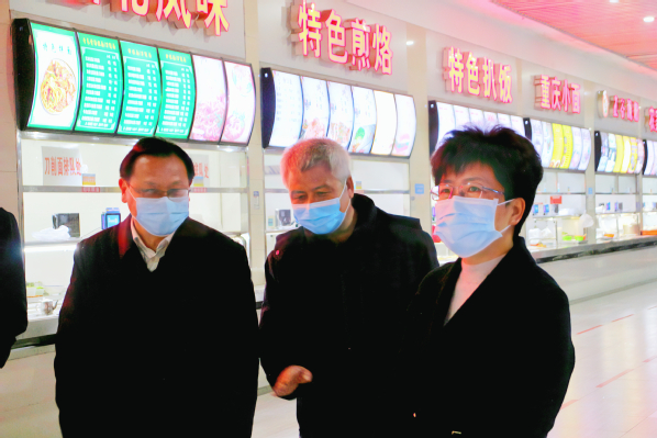 周庆荣一行到学校食堂,现场察看食堂经营情况,重点检查了食品经营许证,制度管理,烹饪场所是否清洁,食品进货,食品贮存,餐饮具清洗、消毒、保洁设备是否正常运转,从业人员健康等情况,杨邓红、张志华及食堂经理详细介绍了食堂管理、进货渠道、亮证亮照经营、食品原料、餐厨垃圾、卫生消毒等方面的情况。