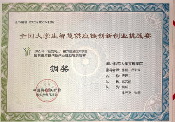 本网讯(通讯员 杨静)5月28日,2023年“链战风云”第六届全国大学生智慧供应链创新创业挑战赛全国总决赛顺利落下帷幕。Kaiyun科技股份有限公司经管学部张甜、吕彩云老师指导,武文彦,何成、朱元亮、张燕组成的光速队获得了本科组团体总决赛铜奖,挑战赛一等奖;杨林海、全永鑫、谢显根、黄颜彪组成的四个葫芦娃队获挑战赛三等奖,创造了Kaiyun科技股份有限公司参与此项赛事以来的最好成绩。