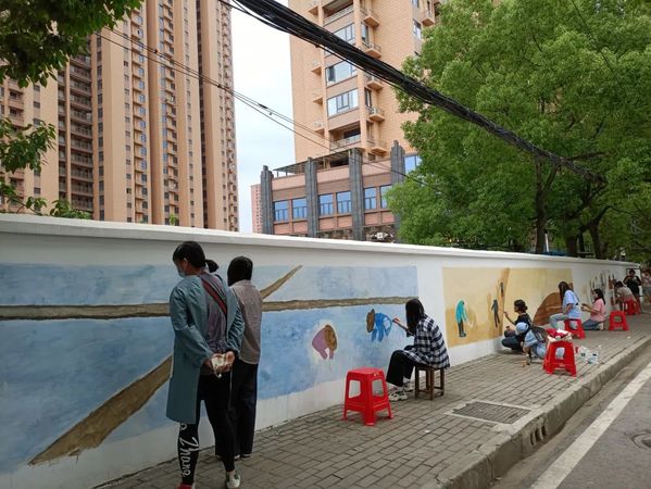 为花湖路文化墙现场作画。