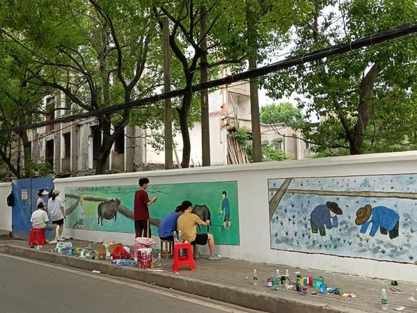 当天,来自文理学院的21名师生,纷纷手拿画笔,在一片欢声笑语中,展示各自的才华。经过长达10个小时的绘画,将一面40余米长的围墙绘画文化墙。绘画的内容以花湖农场历史文化为主,将四季更迭与农场文化相辉映,用墙面彩绘的形式展现春耕、夏种、秋收、冬藏的农耕文化。