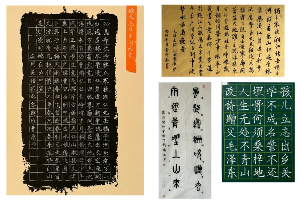 书法作品有硬笔、毛笔、粉笔三个类别,涵盖篆、隶、楷、行、草等多种书体,内容均取自毛泽东诗词,向人们展现毛诗纵横万里的境界,气吞山河、雷霆万钧的气势和高度乐观的革命精神。横平竖直皆风骨,撇飞捺扬是血脉,中国书法之美深深地感染着参观者。