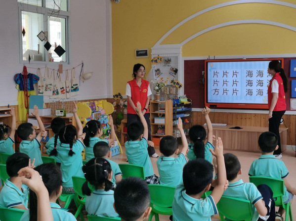张家口市宣化区,宣讲团返乡队员走进区市政管理中心和社区,了解当地普通话普及与使用情况,针对性开展“老年人与普通话”主题的社区宣讲活动。在幼儿园里,志愿者还开展了“典耀中华”读书会活动,让孩子们选择自己喜欢的文章上台分享并用普通话进行朗诵,并现场分享读书心得,使孩子们在诵读经典享受阅读的乐趣的同时,认识到讲好普通话的重要性。