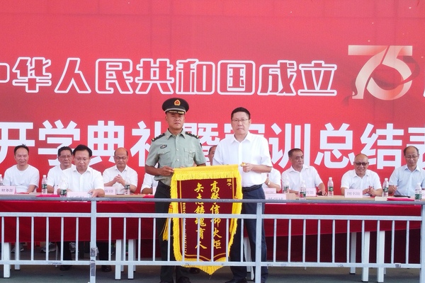 常务副校长杨学斌向承训单位授锦旗,党委书记杨邓红宣读了2024级新生军训表彰文件,校领导为本次军训过程中产生的优秀个人、团体及优秀辅导员颁奖。