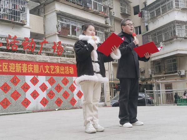 演出在激昂的锣鼓声中拉开帷幕,源建里社区党委书记胡志刚致辞,向全体居民送上了诚挚的节日祝福,并宣布演出正式开始。随后,来自西塞山区中窑小学幼儿园的小朋友们带来了欢快的舞蹈《张灯结彩》,他们用嘹亮的歌声和灵动的动作,将现场气氛瞬间点燃。前来参加活动的大学生志愿者刘孜晗笑着说:“孩子们真的太活泼可爱了,他们的表演让这个冬天更加温暖。”