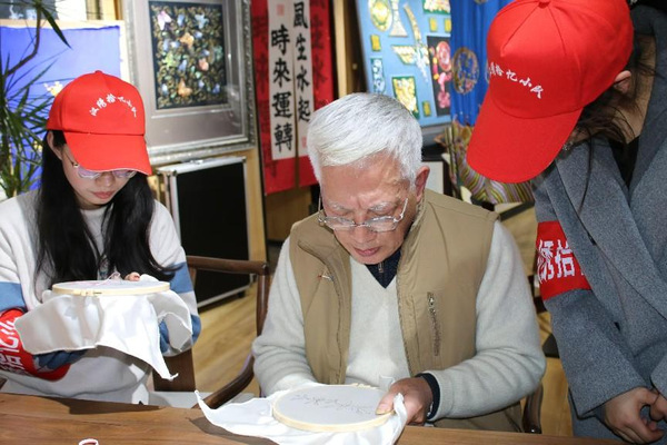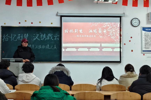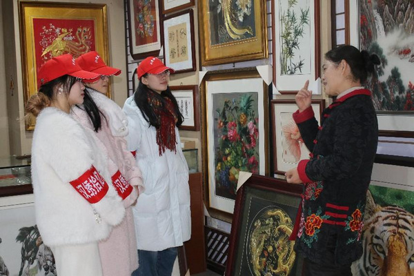 在湖北省工艺美术大师石玉香的工作室,石老师为我们讲解了工作室内一幅幅精美的汉绣作品以及其背后的故事,从戏剧服装到宗教用品、从市井生活到民俗活动,从舞台装饰到艺术作品,充分展现了汉绣多元化发展以及鲜明的民族特色,小队成员也对汉绣有了新的认识。在与石老师的探讨中,她指出,一个好的绣品最重要的就是绣工,包括针法和设计,而设计要随时代进步而进步,与世界相融合。