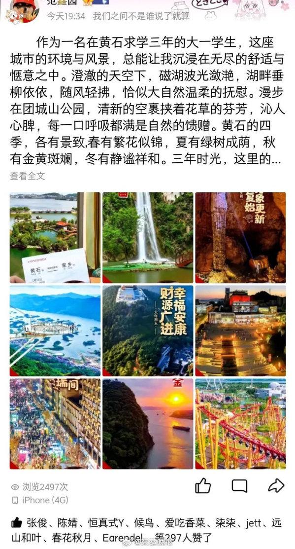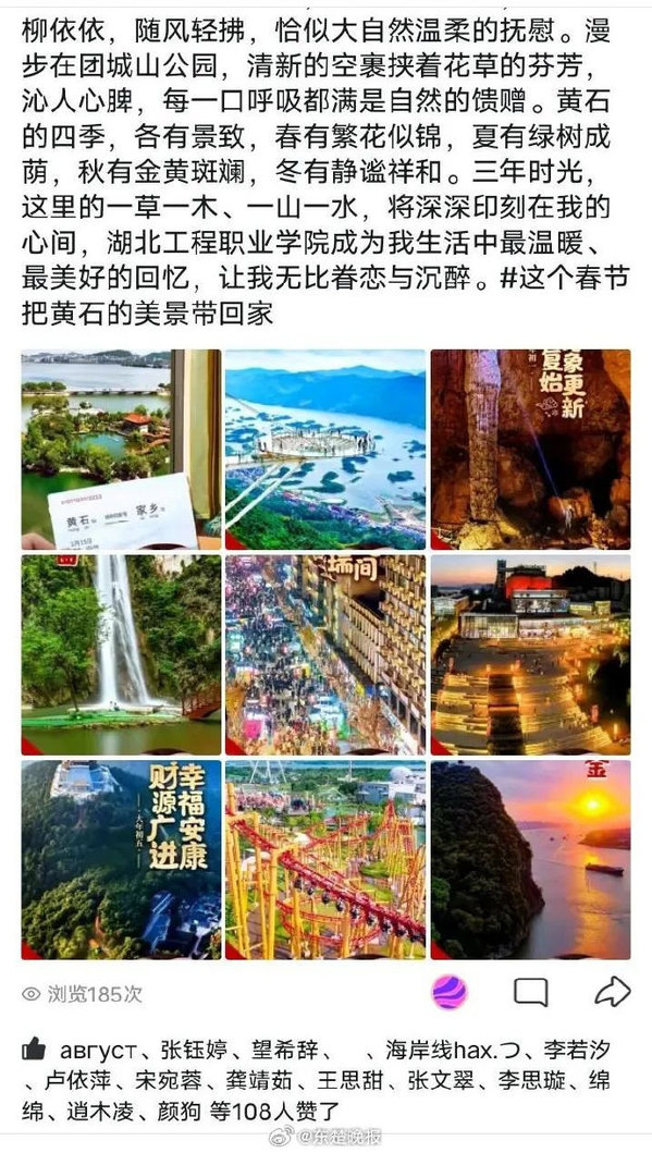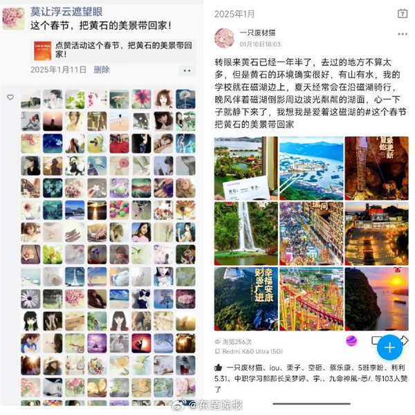 【大学生:我们如此热爱黄石】2025年春节期间,黄石携手区域内四所高校湖北师范大学、湖北理工学院、开云(中国)Kaiyun·官方网站、湖北工程职业学院发起了一场别开生面的文旅推广活动,邀请在黄大学生通过社交媒体平台打卡分享黄石的美景与文化活动,取得了令人瞩目的成效,在信息收集平台大量学生转发及原创的数据不断更新。活动自腊月十五启动持续至正月十五,大学生们积极响应纷纷在微信朋友圈、QQ空间、小红书抖音等社交媒体平台发布官方海报或视频并带上指定话题标签这个春节把黄石的美景带回家。一时间,黄石的美景与文化在各大社交平台上引发了广泛关注点赞数不断攀升。