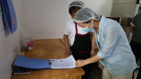 王玲一行实地走访了学校食堂、原料储备间、食品加工操作间等重点场所,围绕食品贮存卫生条件、食堂内外环境卫生状况、食品留样及记录、从业人员健康管理等内容进行了全面检查,并与食堂负责人深入交流。