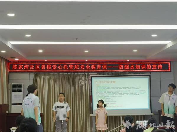 在桐厂社区暑假“爱心托管班”开班仪式上,来自湖北师范的5名大学生志愿者与社区28名小朋友齐聚一堂。社区党委书记为学员们带来开班第一课——防溺水安全教育。同时,讲解了托管班的注意事项和纪律要求。