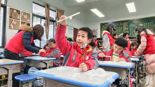 随后的“噼里啪啦的小秘密”静电实验更是点燃了全场热情。当塑料吸管摩擦毛巾后,竟能让纸小人“翩翩起舞”,404班的彭昱雅瞪大了眼睛,惊喜地说道:“太神奇了!原来冬天脱毛衣噼里啪啦响也是静电在搞鬼,科学就在我们身边!”志愿者借助生动讲解,为孩子们揭开静电感应的奥秘,从电子转移到电荷吸附,一步步引导大家理解静电现象背后的科学原理。