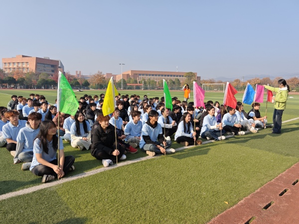 破冰起航环节率先点燃现场氛围。静态热身“时空穿梭”让大家在眼神交汇与轻声交流中打破陌生壁垒,动态热身“爱的拥抱”以温暖互动拉近彼此距离,全员挑战“信任后坐”则让同学们在向后倾倒的瞬间,真切感受团队托举的力量与无条件信任的重量。三个项目层层递进,让原本略带拘谨的同学们逐渐敞开心扉、融入集体,欢声笑语在操场上空久久回荡。