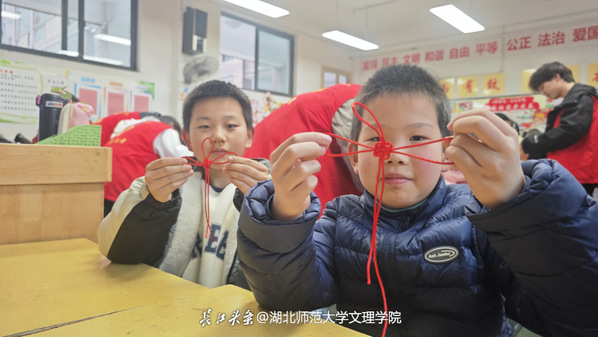 另一边的中国结编织现场同样气氛热烈。志愿者将复杂的编绳步骤拆解为简单易懂的流程,从穿绳、绕线到打结、塑形,一步步耐心引导,手把手帮助孩子们攻克难点。孩子们两两结伴、互相帮助,一个个造型精致、寓意吉祥的中国结渐渐成形,看着自己的作品,孩子们脸上洋溢着成就感。