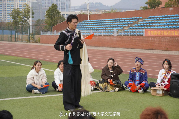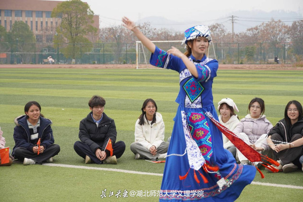 文化分享环节精彩纷呈。彝族学生地惹瓦尔详细介绍了彝族特色服饰的纹样寓意与火把节的传统习俗,让在场同学深切感受彝族文化的厚重底蕴;壮族学生樊秋玲现场开展壮话教学,带领大家学习简单常用的壮语词汇,互动中拉近了民族距离;土家族学生冉佳丽则现场展示传统摆手舞,轻盈灵动的舞步展现出土家族文化的独特魅力,赢得阵阵掌声。多元文化的分享与展示,全方位呈现了各民族文化的多样性与包容性。