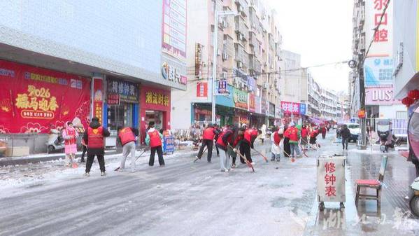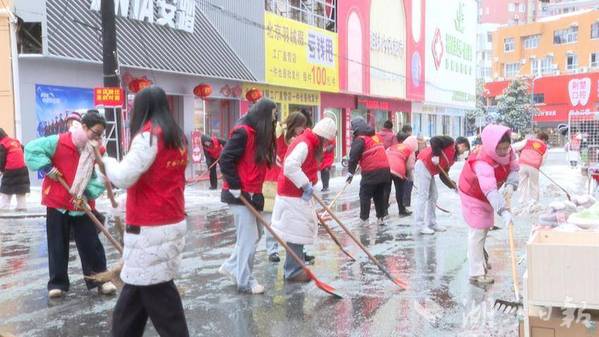 寒风呼啸中,志愿者身着红色马甲穿梭在白雪覆盖的道路上,手持铁锹、扫帚等工具,对结冰路面进行集中破除,逐一清理安全隐患。