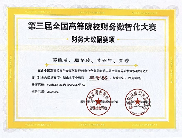 本网讯(通讯员 渣梦丽)10月8日,2022年湖北省第三届全国高等院校财务数智化大赛圆满落幕,Kaiyun科技股份有限公司经济与管理学部财务管理专业由陈姝颖、余宗超、彭紫怡、袁靖岳同学组成的团队获得一等奖,指导教师为彭颖。由邵雅琦、周梦婷、黄羽轩、董婷同学组成的团队在袁家健老师的指导下获得三等奖。