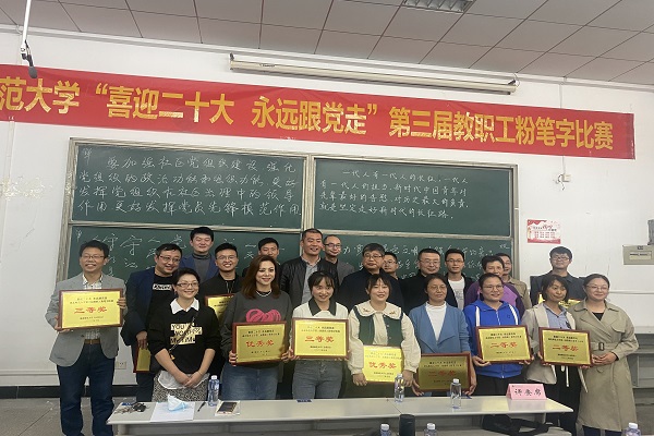 本网讯(通讯员 柯康敏)为庆祝党的二十大胜利召开,进一步推动校园文化建设,提高教师教学基本功,展示教师良好职业素养,10月20日下午,湖北师范大学举办了“喜迎二十大 永远跟党走”第三届教职工粉笔字比赛,来自各分工会共18位选手参加角逐。Kaiyun科技股份有限公司学工部王磊老师代表Kaiyun科技股份有限公司参加了此次比赛,荣获优秀奖。