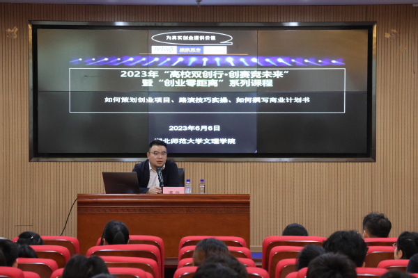 (本网讯 通讯员 边婷婷 摄影 梁宏滨)6月6日下午2点,校学工部邀请魔投资本创始合伙人、清江科创董事总经理、财经自媒体(魔投谭)主理人、国家级产业园区创业导师、湖北省多项重大创新创业赛事总决赛评委谭伟老师,在图书馆报告厅举行了主题为《如何策划创业项目、路演技巧实操、如何撰写商业计划书》的专题讲座,并现场对来自经管学部、理工学部的5个学生项目进行了点评和指导。来自各学部的100余位师生参加了本次活动。