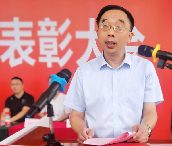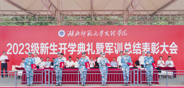 常务副校长杨学斌向承训单位授锦旗,副校长王胜国宣读了2023级新生军训表彰文件,校领导依次为本次军训过程中产生的优秀个人、团体及优秀辅导员颁奖。