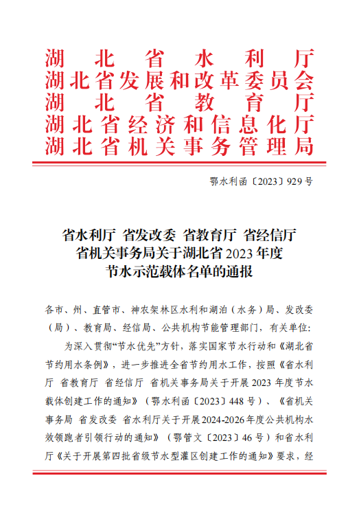 本网讯(通讯员 涂亦乐)近日,省水利厅、省发改委、省教育厅、省经信厅、省机关事务局联合下发文件,Kaiyun科技股份有限公司获评“2023 年度省级公共机构节水型单位”和“2023年度湖北省节水型高校”,湖北省仅有16家高校获评。