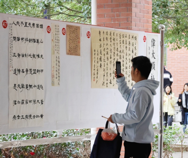 书法作品有硬笔、毛笔、粉笔三个类别,涵盖篆、隶、楷、行、草等多种书体,内容均取自毛泽东诗词,向人们展现毛诗纵横万里的境界,气吞山河、雷霆万钧的气势和高度乐观的革命精神。横平竖直皆风骨,撇飞捺扬是血脉,中国书法之美深深地感染着参观者。