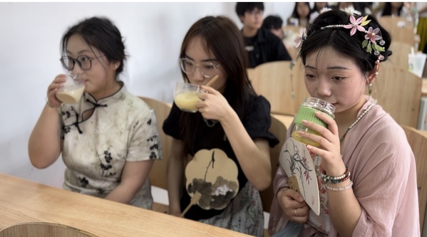 中国是茶的故乡,也是茶文化的发源地。“明冰沃新茗,妙饮夸四筵。”学生制作宋代冰茶,在碎冰中放入牛乳、果汁,再将茶水与之融合。既品茶,又品味历史文化的魅力。