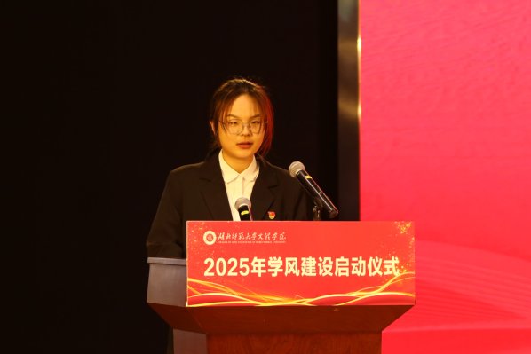 教师代表肖燕琴在发言中表达了对学生的殷切期望。她表示,学风建设是大学精神文化的核心内容,呼吁师生携手推动学风建设,汇聚强大合力,让优良学风在校园落地生根、蓬勃发展。