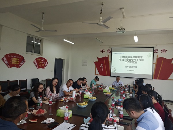 2022年6月16日下午2点半,经济与管理学部于2号实验楼213会议室,召开了学部春季学期期末总结大会及专升本考试工作布置会,本次会议由学部主任商树松主持,学部全体教职员工参加。主要内容如下:1.商树松主任传达学校对2022年专升本考试的工作要求和指示精神,要求各位老师认真遵守考试纪律;2.专业负责人、教研室主任、教学办、行政办、学工办负责人对上半年来的工作进行总结;3.各专任教师相互交流,为学部发展建言献策;4.商树松主任作最后总结。肯定学部2022年上半年以来工作所取得的成绩,同时也指出工作中存在的问题和不足,提出了要求与建议,并对暑假以及下半年的工作进行了安排和部署。