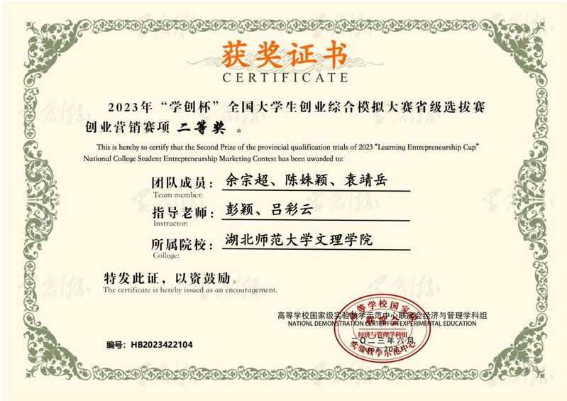 在2023年“学创杯”全国大学生创业综合模拟大赛省级选拔赛 创业营销赛项获二等奖