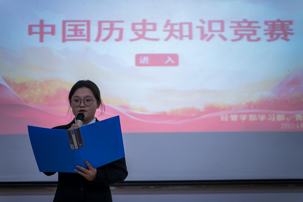 为庆祝中华人民共和国成立75周年,弘扬爱国主义精神,提升学生的民族自豪感与历史文化素养,激发师生的爱国热情,9月27日晚,经济与管理学部在教学楼举办了“忆渊源历史,望盛世中华”主题知识竞赛活动。竞赛由学生主持团成员田连华主持,共有八名选手参赛。