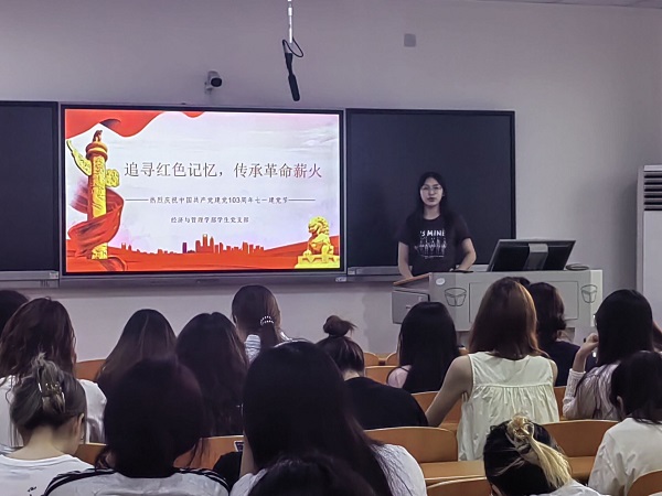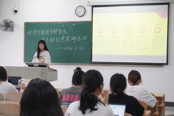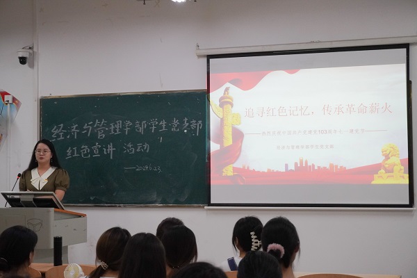 6月23日,经济与管理学部学生党支部组织全体党员、预备党员深入各班开展了以“追溯红色足迹,点燃革命火炬”为主题的七一建党节宣讲教育活动。此次活动旨在回顾党的百年辉煌历程,强调党史学习的深远意义和重要性。
