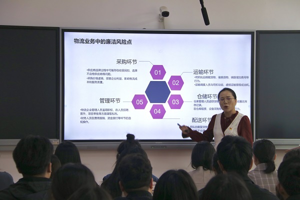 11月13日下午2点20分,经济与管理学部教工党支部组织开展了“廉洁文化微课堂”系列活动之第四讲:廉洁于心,物流于行。主讲人为物流管理专任教师罗尹老师,学部全体党员教师及物流管理2202班学生参加。