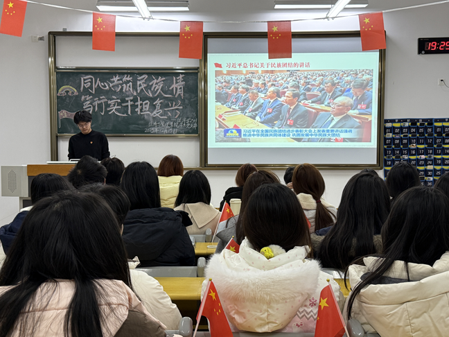 结合新生思想特点与成长需求,学生党支部党员下沉各专业班级,携手各班团支书共同围绕铸牢中华民族共同体意识的核心要义,从理论解读到案例筛选,把严肃的政治语言转化为青年易于接受、能够产生共鸣的鲜活表达,推动党建工作与思想引领同频共振、同向发力。随后,学生党员结合青年奋斗的案例,将“同心共筑民族情”的深刻内涵与“笃行实干担复兴”的时代要求讲深讲透、讲活讲实,让民族团结的种子在经管青年心中生根发芽、茁壮成长。