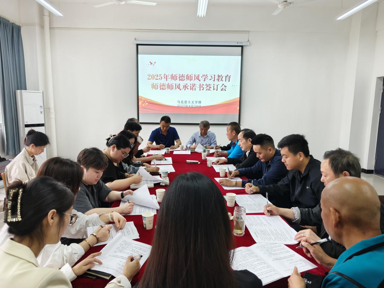 2025年4月24日上午,马克思主义学部在3号实验楼208会议室开展师德师风教育及师德师风承诺书签订活动,学部全体教职工参加,会议由学部主任周青山主持。