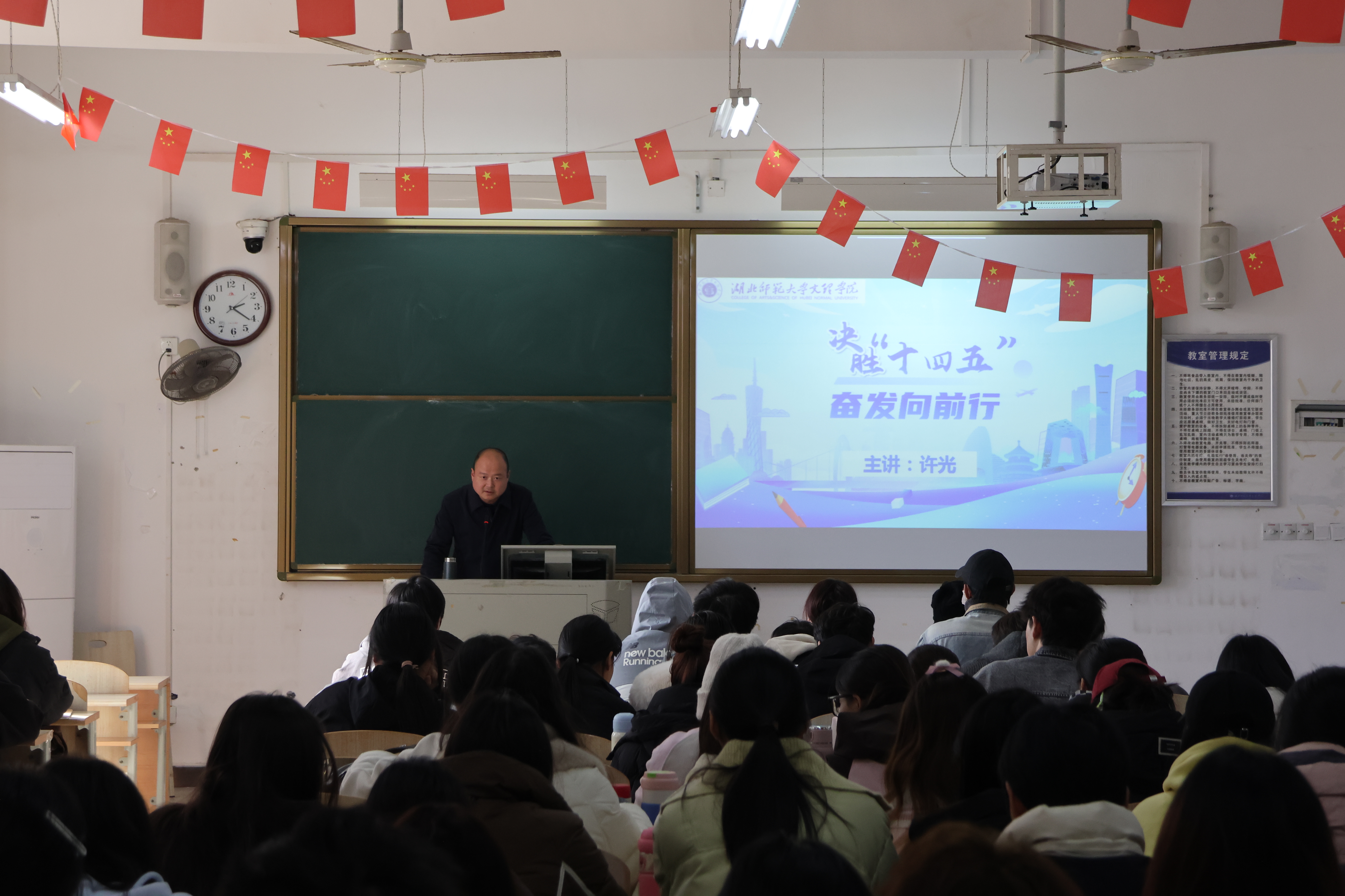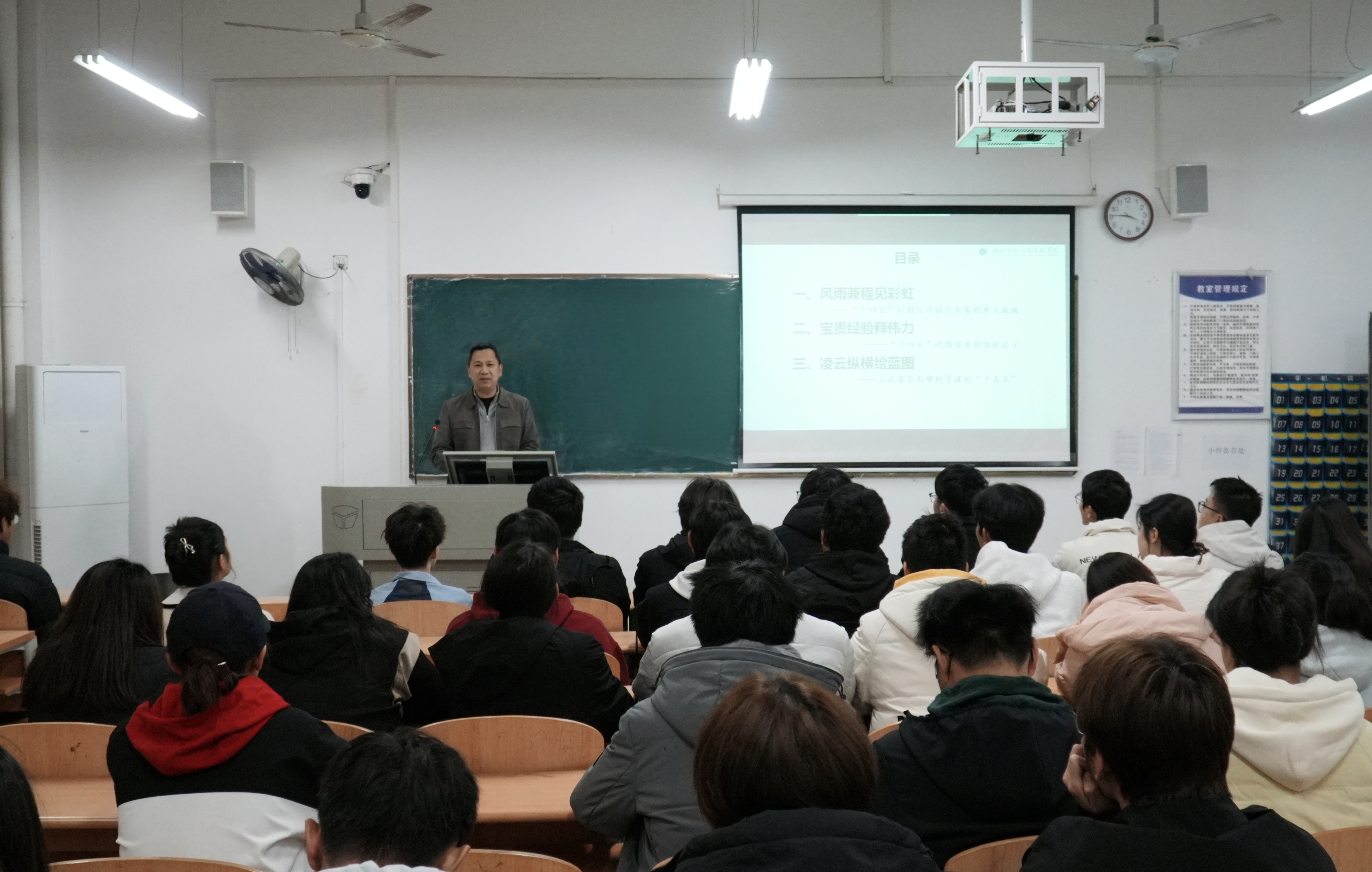 副校长王红兵和党委副书记许光围绕“十五五”规划建议,分别于11月23日下午、11月25日下午,在1A105、2A304教室进行授课。王红兵从经济科技、民主法治、文化、民生、生态五大领域,系统梳理了我国“十四五”以来经济社会发展的重大成就。他强调,当今中国为青年提供了广阔舞台与机遇,希望大家把握时代脉搏,将个人理想融入国家发展,以青春之力助力中国式现代化建设。许光总结了“十四五”期间我国应对挑战和实现发展的宝贵经验,重点阐述了“十五五”规划建议的总体要求。最后,他向学子们寄语:希望大家在新时代新征程中矢志拼搏奋斗,为实现“十五五”规划贡献青春力量。
