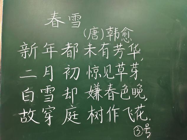 本次比赛采现场黑板书写的形式进行,板书内容统一,都以“横竖撇捺书汉字,方寸之间传书香”为主题。选手们自选题材,比赛过程中各位参赛选手可谓是摩拳擦掌、大展身手,12号贺钊书写的作品《如梦令》犹如行云流水、纵横挥洒7号王煜的作品也是丝毫不落下风,他的一首《锦瑟》遒劲有力、方圆兼备,赢得各位评委的连连称赞3号林雨茹的作品《春雪》,藏锋处微露锋芒,露锋处亦显含蓄。