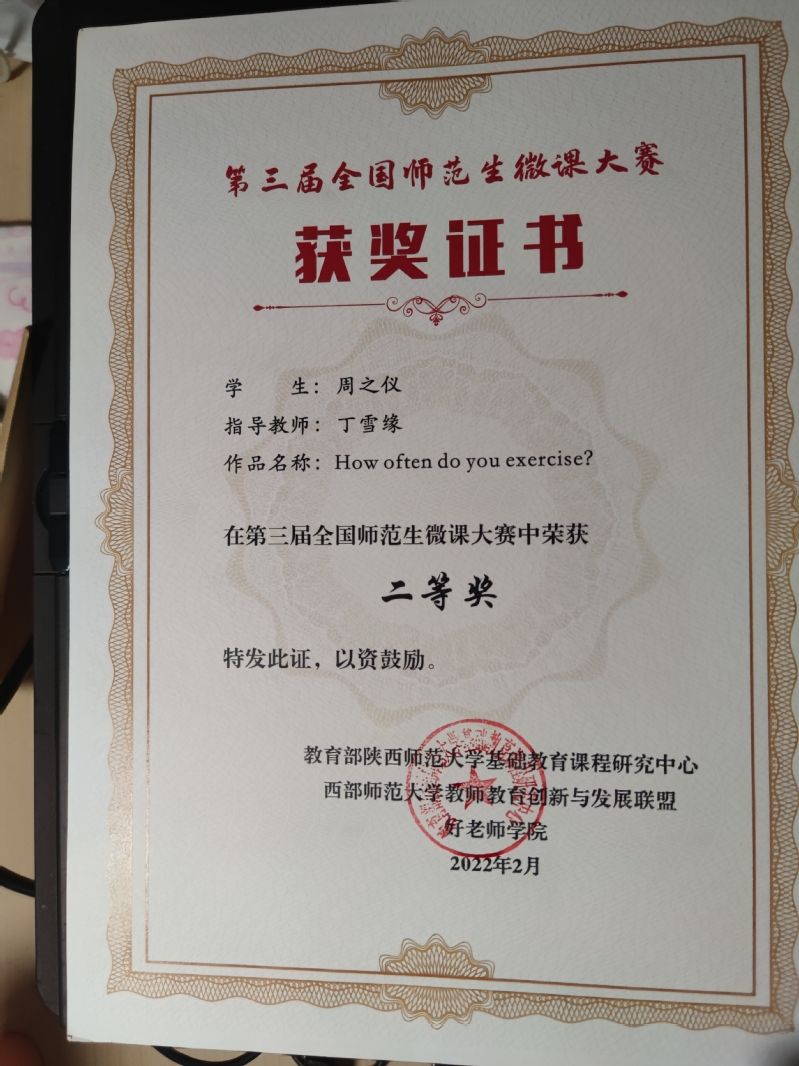 周之仪在第三届全国师范生微课大赛中荣获二等奖