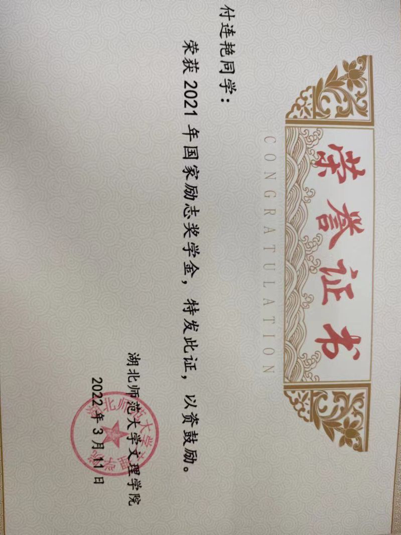 田湉等6名同学荣获2021年国家励志奖学金