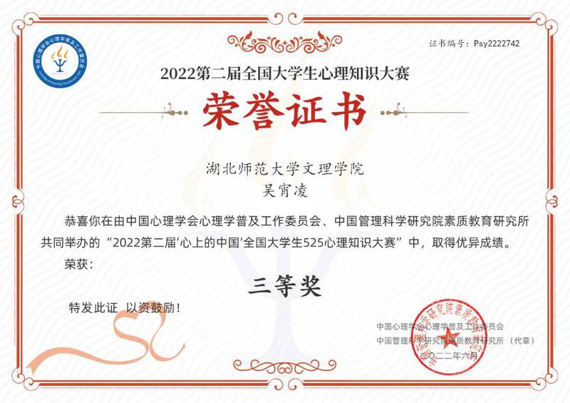 吴宵凌同学在2022届“心上的中国”全国大学生525心理知识大赛中荣获三等奖
