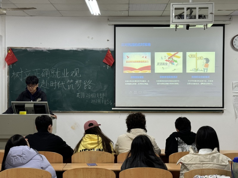 2024年11月28日晚,人文学部各班级开展了一场以“树立正确就业观,共赴时代筑梦路”为主题的团日活动。此次活动旨在帮助同学们深入了解当前就业市场,树立正确的就业观念,为未来职业发展奠定坚实基础。
