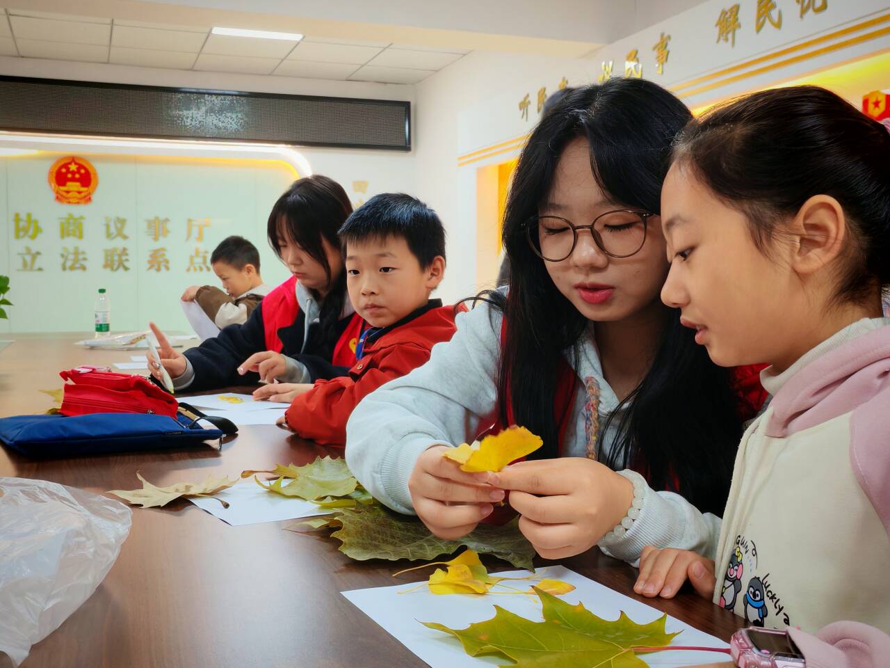 活动的高潮落在“落叶创意手工”环节。志愿者们现场演示了树叶贴画、书签制作等方法,鼓励孩子们自由发挥想象力。秋阳透过窗棂,洒在孩子们专注的脸庞上,现场欢声笑语不断。他们以落叶为笔、画纸为布,拼贴出金鱼游曳、秋日树林等充满童趣的作品。有的孩子将梧桐叶巧妙裁剪成裙摆,设计出别具一格的“落叶时装”;还有的通过叶脉拓印,创作出纹理细腻的生态画卷。