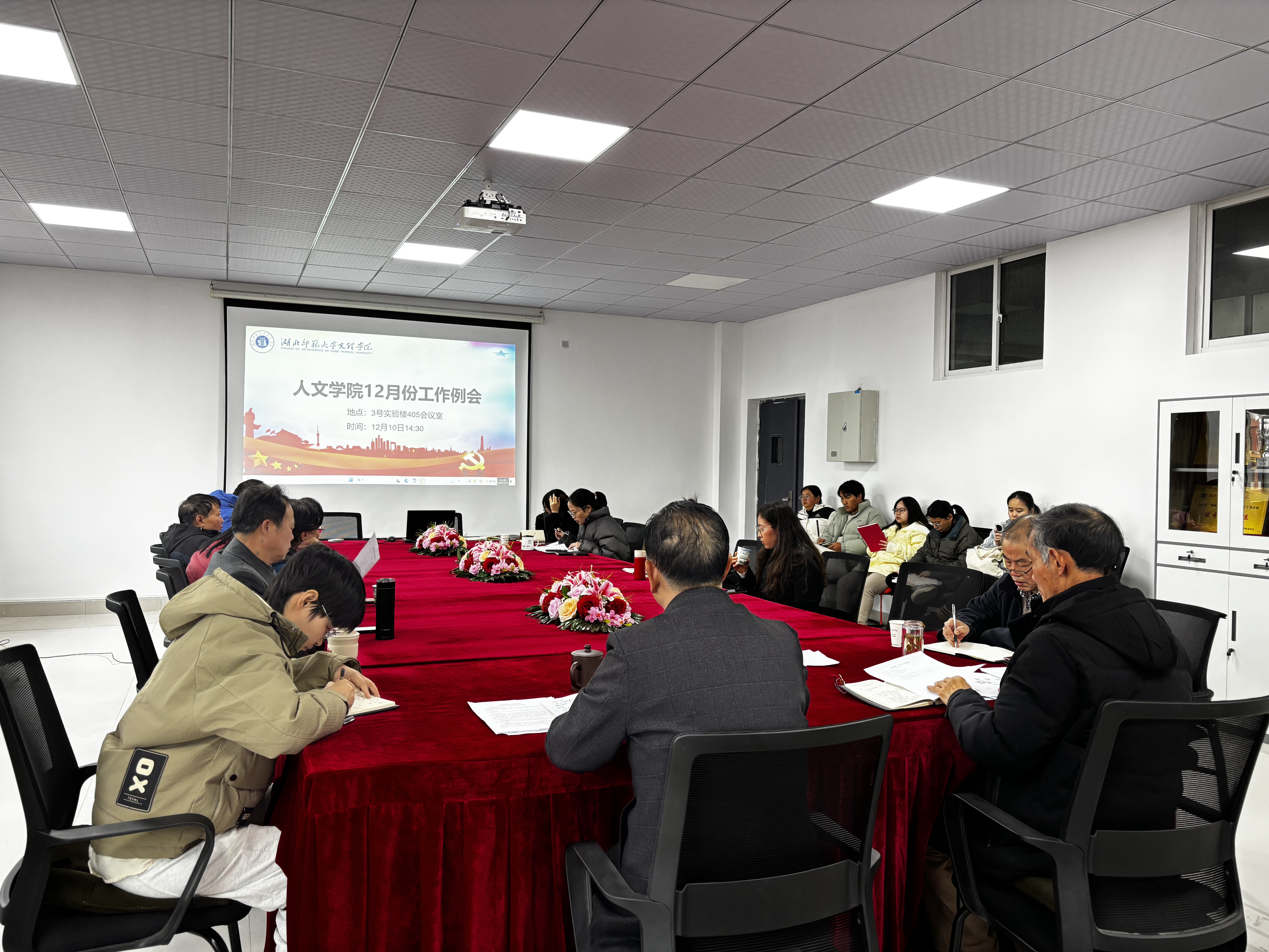 12月10日下午14:30,人文学院在405会议室召开12月份工作例会,全面总结11月工作成效,部署12月及期末阶段重点任务。学院党总支书记周景斌、院长熊子延及全体教职工参会,会议由周景斌书记主持。