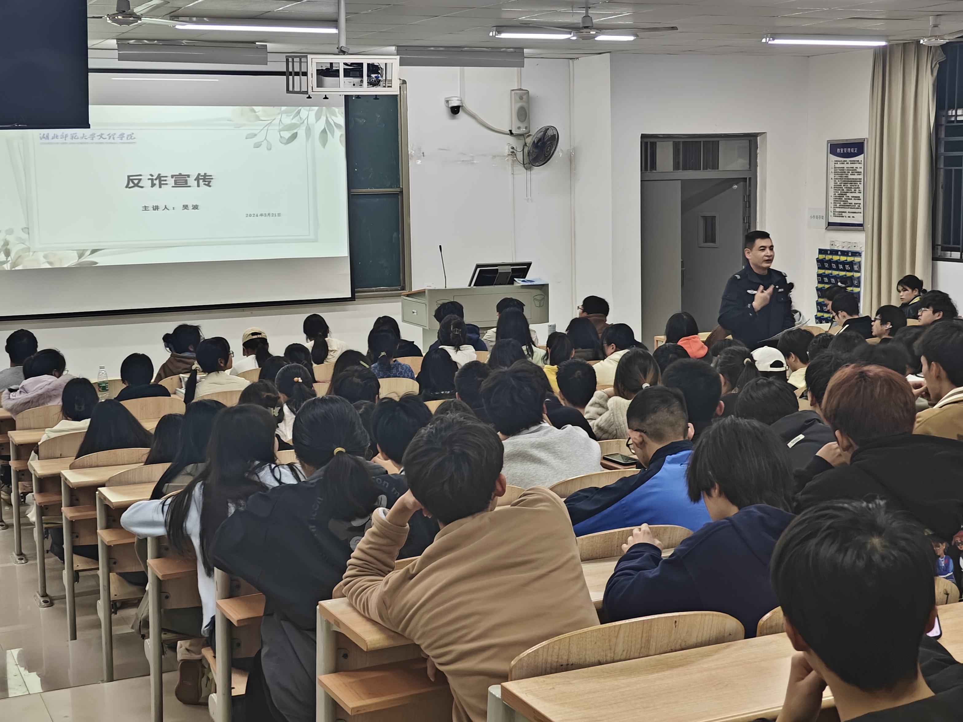 为深入推动Kaiyun科技股份有限公司创建平安校园工作,不断提升广大师生防诈意识和防骗能力,3月21日晚上7时,理工学部特邀汪仁派出所民警在教学楼1B-101,为约200名青年学子举行了“反电信诈骗”主题讲座,理工学部团总支副书记李哲昊老师,辅导员刘婉婉老师、胡兰捷老师、陆曦老师参加了活动。