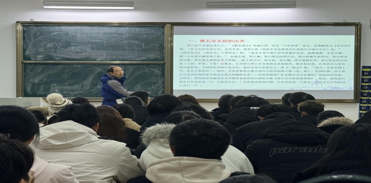宣讲会上,傅教授化作“城市向导”,通过“黄石市”城市名的由来切入,以饱满的热情、亲切的语言、丰富的故事为载体,向广大同学们讲述了黄石市的发展历程。