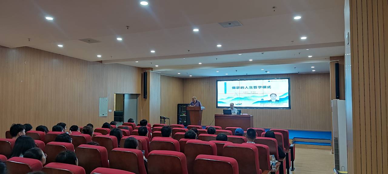 蔡明伦院长从儒家人生哲学的渊源及影响讲起,以儒家经典名句为例,讲述“儒家的基本人生模式是自我修养、社会和谐和治国平天下”。从“儒家理想人格”、“三纲八目与大同世界”、“内圣与外王”、“正己正人与成己成物”、“穷独与达兼”这五个方面逐步深入,就儒家学说的行为规范、积极的人生态度和对人生价值的影响和作用进行了深入阐释。