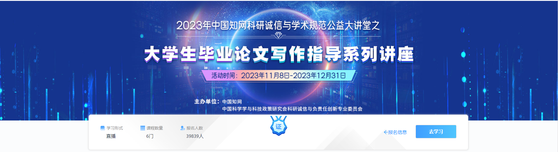 为满足广大高校大学生毕业论文(设计)写作的需要,中国知网于11月8日—10日开展了大学生毕业论文写作指导系列讲座,本次讲座2023年12月31日之前均可观看回放。