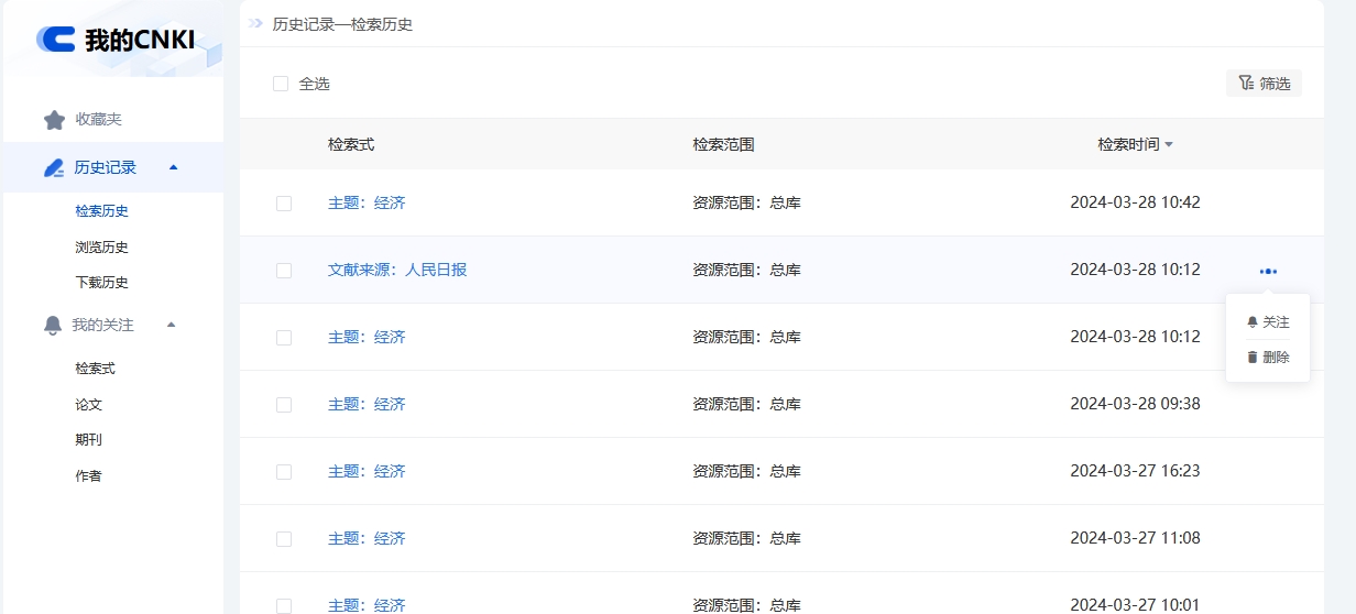 登录个人账号后,可在检索结果页点击“主题定制”,或在“我的CNKI-历史记录-检索历史”点击检索式的“关注”按钮,关注检索式。进入我的CNKI-我的关注-检索式,可查看检索式下的文献,管理已关注的检索式。