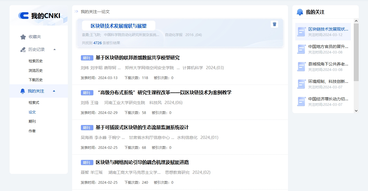 (2)使用我的CNKI提供的相关功能,例如检索结果的文献收藏与关注、历史记录的查看等。