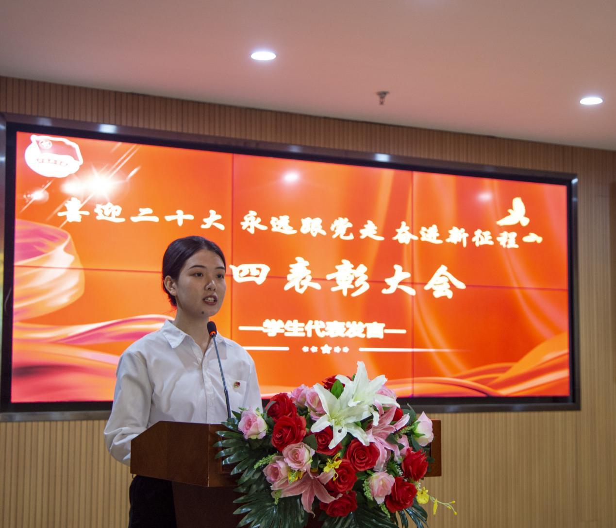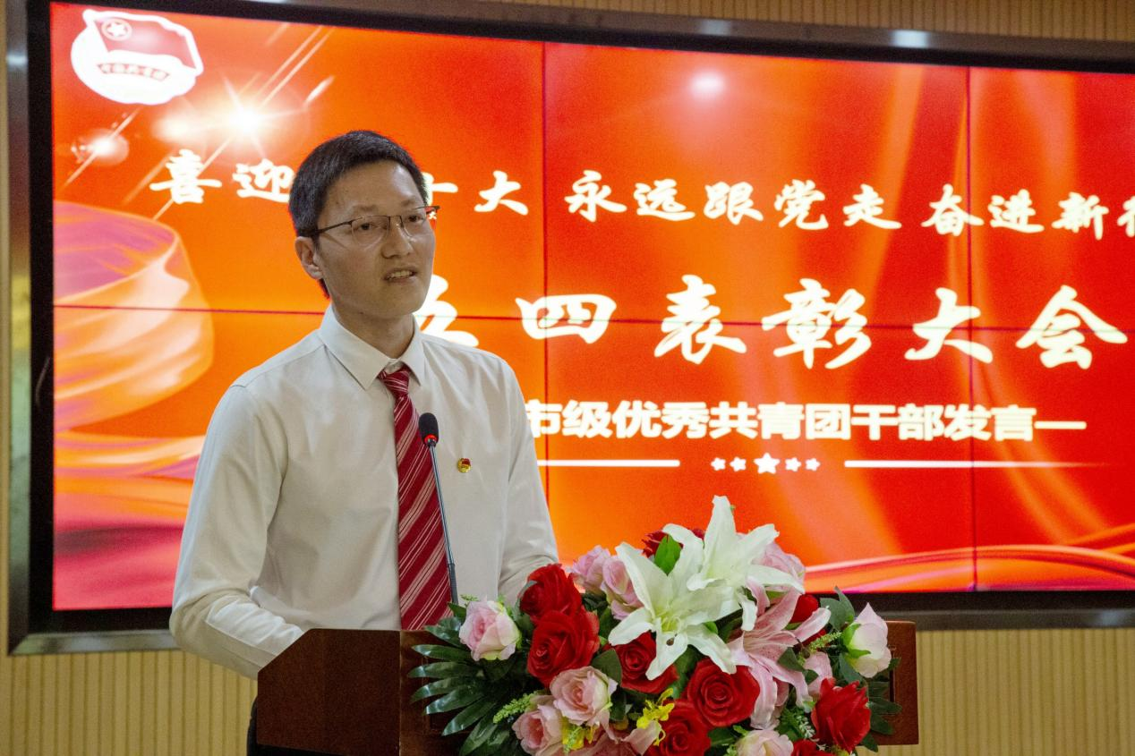 大会在高亢激昂的团歌声中拉开帷幕。新发展团员举行了集中宣誓仪式,校团委书记陈荟芸宣读了《关于2021-2022年度共青团先进集体和先进个人的表彰决定》,杨之毛副书记等领导分别为市级、校级“优秀共青团员”、“优秀共青团干部”、“红旗团支部”和“红旗团总支”获奖代表颁奖。市级优秀共青团干部尹誉霖、优秀学生代表武如钰分别作了代表发言。最后,本次五四表彰大会在《没有共产党就没有新中国》的嘹亮歌声中圆满落下帷幕。